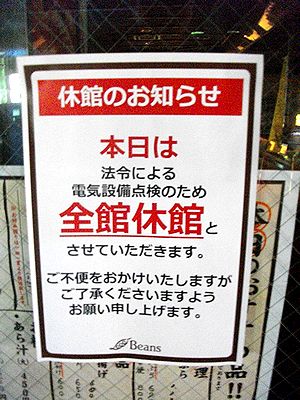 | 1週間ぶりに漫歩できた。ここのところ、晴れた日は忙しくて歩けず、歩ける日に限って雨が降るということが続いていた。よほど普段の行いが悪いのか、大人しく家で仕事をしろという神様の思し召しなのか。 池袋での所要を終えた後、ビーンズ赤羽にある店で買い物をしたくて歩いたが、残念ながらこういう結果に。なんか、こういう臨時休業に当たることが多いなぁ。調べないで行くのが悪いと言われればそうなんだけど、そんなに何もかも調べてから行く人って、なかなかいないと思う。よほど普段の行いが悪いのか、金を使うなという神様の思し召しなのか。 |