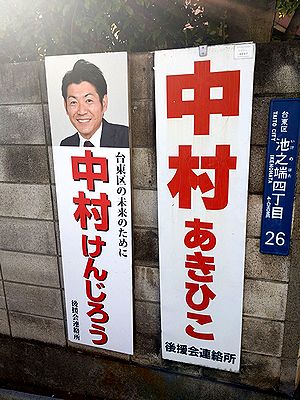 | どうしても銀行へ行かなければならない用事があって、外出。そのついでに歩く正当な理由は? と問われると困るのだけれど、結果的に歩いてしまった。外出自粛ムードが高まる中でのことだから、あまり胸を張っては言えないね。でも、要は「人との接触を避ける」「“密”を作らない」が大事なわけだから、人込みを避けて歩けばそう後ろめたさを感じることはないのかなと思う。歩かないと、死んじゃうし。少なくとも、地元の商店街に家族総出で“密”を作るよりはマシかなと。 写真を1枚。親子議員ですかね(台東区池之端4丁目)。地元では、たいへんな名家なのでしょうね。 |