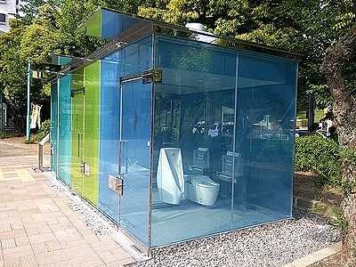 | 代々木公園と小田急線の間に挟まれた、はるのおがわコミュニティパーク。ここに、一時期話題を集めた透明トイレがある。完全スケルトンで、外から便器が丸見え。もちろん、中からも外が丸見えなのだが、なんと鍵をかけた瞬間に窓が磨りガラスに変わる。そもそも透明にする必要があるのかという疑問が残らないでもない(路上から便器が見えるのは、決して気分のよいものではない)けれど、なるほど、こりゃ面白い。子どもたちにとっては、格好の遊具になるだろう。 ちなみに、この公園名は、童謡「春の小川」の発祥地であることに由来しており、公園の裏手に記念碑がある。 |