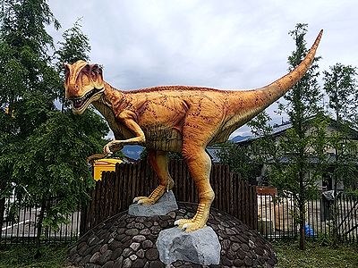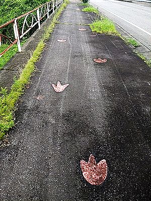 | 梅雨の時季は、なかなか歩けないことを覚悟しなければならない。とはいえ、雨続きで1週間も間が空くと、さすがに焦る。このままずっと歩けないのではないかと、悪い方にばかり考えてしまうのだ。今日も黒いちぎれ雲が上空を足早に駆けていたけれど、なんとか歩けた。そろそろ梅雨も明けそうだし、これから歩数も頻度も伸ばしていきたい。 福井県勝山市は、恐竜の化石が多数発掘されていることで知られる。恐竜博物館を目当てにやって来る観光客も多い。そんな市内を歩いていると、頻繁に恐竜の足跡に出合う。その持ち主は、コイツかな? |