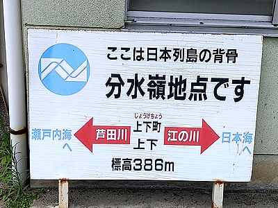 | 備後矢野駅での公式取材を終え、時刻表を見ると、次の便までまだ5時間近くあった。なんと、日中はほとんど列車がやって来ないのだ。こうなると、もう歩くしかない。カンカン照りの猛暑の中、アップダウンを繰り返す田舎道を歩いた。途中、何回タオルを絞ったかな。もう、タオルがポカリスエットみたいな臭いになっているよ。 写真を1枚。意外なところに、分水嶺があった。こういうところを歩くと、ワクワクするね。中国山地のの分水嶺は広島・島根の県境かなと思っていたが、だいぶ南に寄っているんだね。三次市から県境にかけては、意外と標高が低いのか。 |