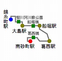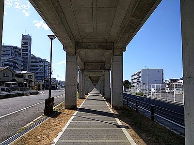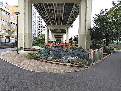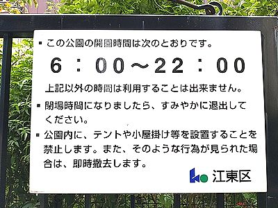| JR総武線と都営地下鉄新宿線の間、首都高速7号小松川線の高架下に、竪川河川敷公園が整備されている。ベンチがたくさんあって、子どもたちが遊べるような水場もあって、フットサルコートまである。そしてなにより、車が入ってこないから歩きやすく、しかも長~く歩けるのがいい。漫歩コースに組み込むのに最適な公園だ。こういう公園が、自宅近くにも欲しいなぁ。 ただ、残念ながら、24時間いつでも歩けるわけではない。夜間は、閉鎖されてしまう。高架下で、ある程度雨露をしのげるから、ホームレスが住み着いてしまうんだろうなぁ。 |