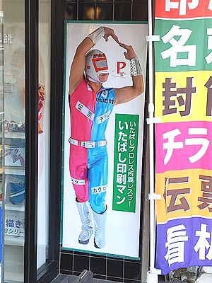 | 自宅缶詰生活は、せいぜい3日が限界だ。頭がプキュッと破裂しそうなくらい痛くなる。歩かないと体調が維持できない体に、なってしまったなぁ。1回あたりの歩数は控えめにするとして、頻度は無理に下げない方がいいような気がする。その方が、結果的に仕事の進みも早いのではないかと。 今日の写真。キモすぎるご当地レスラー(上板橋駅付近)。完全に冗談かと思ったのだが、実在するレスラーで、試合も行っているらしい。ハッピーロードマン、なかいたへそマスク、トキワダイオー、としょカーン……。ダサすぎるがゆえに、少しばかり愛着も湧く。 |
