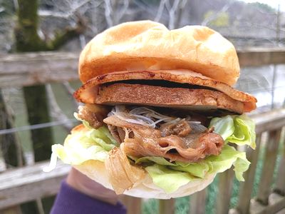| 今日は札所なしデーだが、札所と同じくらい重要というか、名高いお参りスポットを通る。それが、大洲市街の東の外れにある十夜ヶ橋。ここは弘法大師が橋の下で野宿したと伝えられる場所。野宿派の遍路の中には、近くの大師堂でゴザを借りて、ここで一泊する予定を組む人も多い。私もそうしたかったのだが、さすがに3連続での野宿は無理。朝のうちにお参りするにとどめた。 昼には、道の駅内子フレッシュパークからりで、「内子豚もろみ焼きバーガープレミアム」をガブリ。ご当地バーガー巡りも、絶賛継続中! |