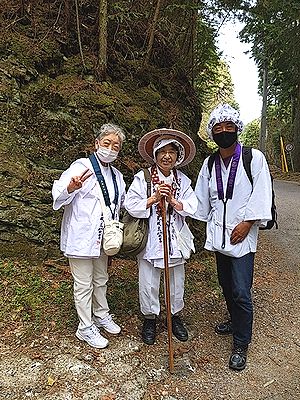 | 愛媛県内の最後の難所・横峯寺へのアタック。登りはなんとか2時間でクリアできたが、意外にも苦戦したのは下りの方だった。傾斜が緩やかなだけに、山道がとても長い。香園寺へ降りるまでに、4時間かかった。その後、密集する札所を4つ回って、新居浜市内のホテルまで。途中で宗教勧誘につかまったこともあり、ホテルに着いたのは20時だった。いやぁ、ハードな1日だった。 横峯寺では、遍路バスツアーの一行に遭遇。ツアーとはいえ、駐車場から本堂までは数百メートルの坂道。まん中のお婆ちゃんは、なんと御年96だという。元気だなぁ。 |