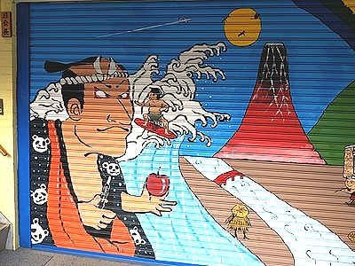 | 曇りのち晴れの予報で、昼前に薄日が射し始めたのを確認してから歩き始めた。それなのに、家を出て10分で雨が降り始める。レーダーを見ると東西に細長い雨雲が南下してきている様子だったので「すぐに止むだろう」と思っていたら、2時間ほど降り続いた。しかも、王子から小台くらいまでは、傘がないとどうにもならないような本降り。なんでこうなるかなぁ。いい加減、雨男の称号を返上したいのだが。 今日の写真。富嶽三十六景をまとめたようなイメージかな。北斎的だけど、よく見ると力士が荒波でサーフィンをやっていたりする。こういうセンス、結構好き(三ノ輪駅付近)。 |