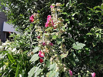 | 先日までの冷夏ムードから一転して、猛烈な暑さ。梅雨前線、どこ行った? この気温の変化には、体がついていかない。無理に歩数を伸ばそうとすると、命を危険にさらすことになりかねない。ただでさえ、なんだか慢性的に首の後ろが痛くて、全身が重だるいのに。それは必ずしも気候のせいだけではなくて、遂に第12弾単行本の原稿催促連絡が来たからということもありそうな気はするが。たまには遠征漫歩をしたいのだけれど、あらゆる方向から考えて、今はとうてい無理。 写真を1枚。あまりの暑さに、タチアオイも完璧グロッキー(新宿区北新宿1丁目)。 |